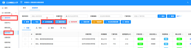 第二步:“基础信息”---“实验场所”---“工作栏展开”---“场所开放”。